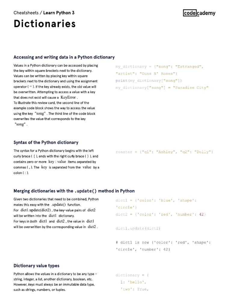 Learn Python 3 - Dictionaries Cheatsheet | PDF