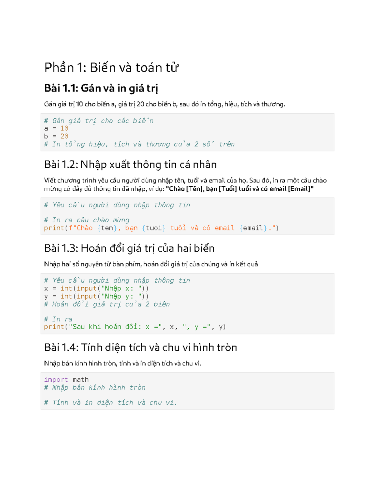 Bài Tập Python Cơ Bản: Biến, Toán Tử và Cấu Trúc Dữ Liệu T3 - Studocu