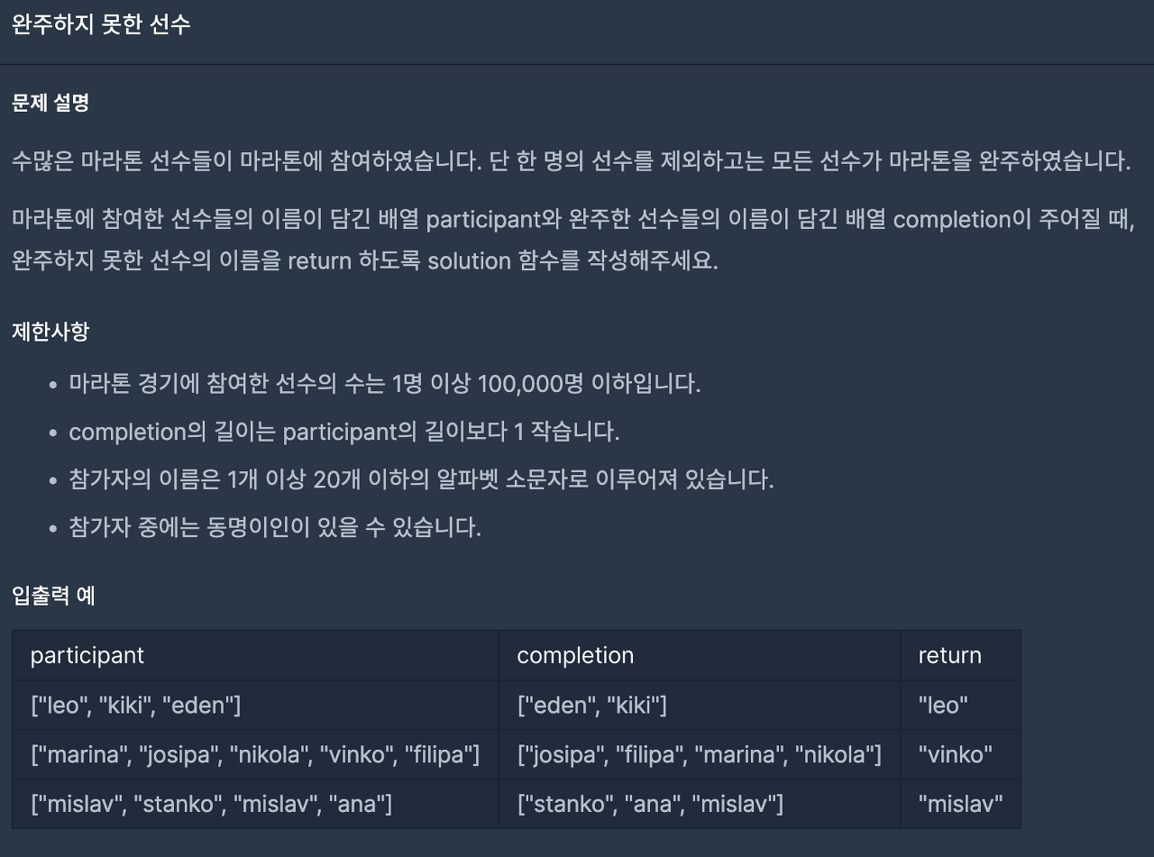 [프로그래머스] 완주하지 못한 선수 (python)