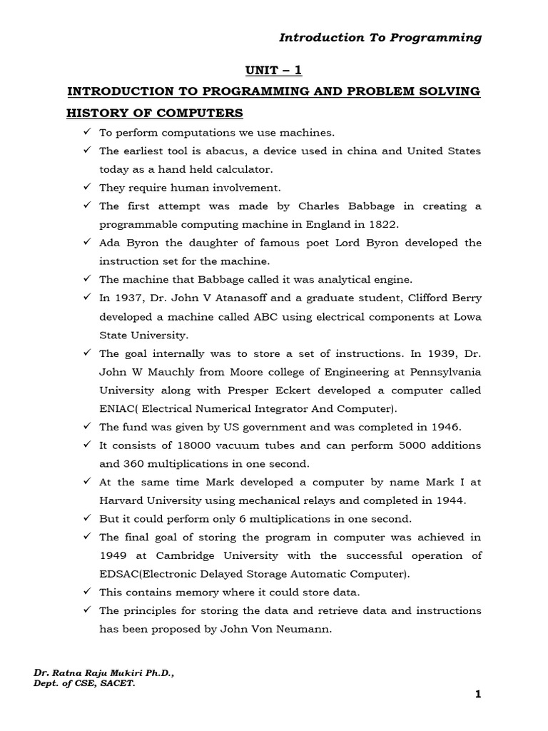 UNIT 1 Introduction To Programmming and Problem Solving | PDF ...