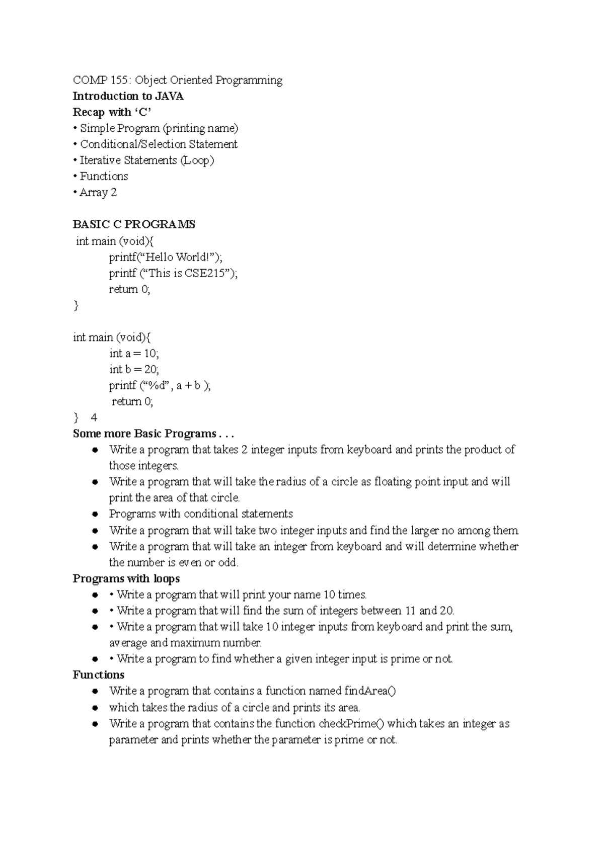 COMP155 Lecture 1: Intro to Java & Basic C Programming Concepts - Studocu