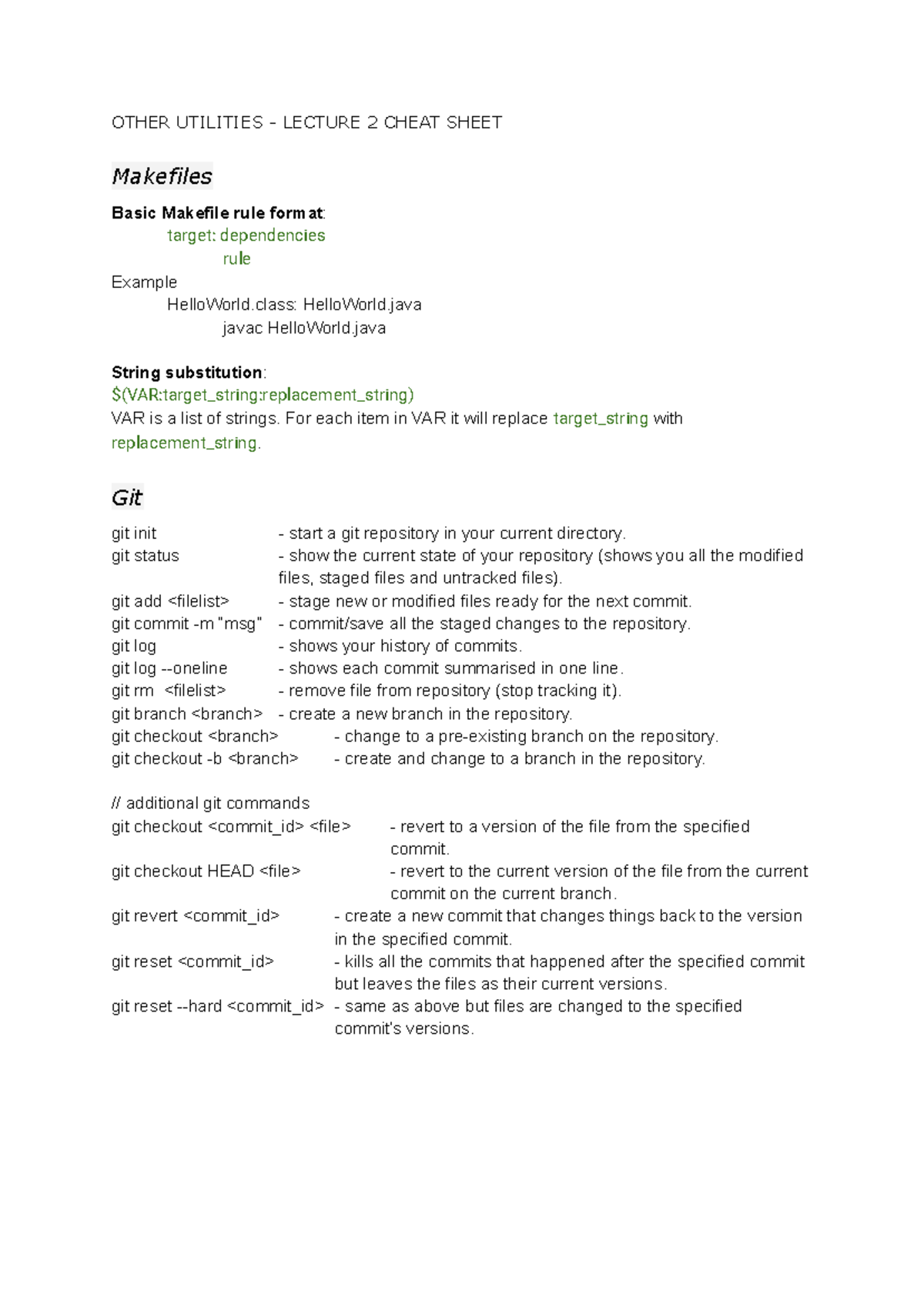 OTHER UTILITIES LECTURE 2 CHEAT SHEET: Makefiles & Git Commands - Studocu