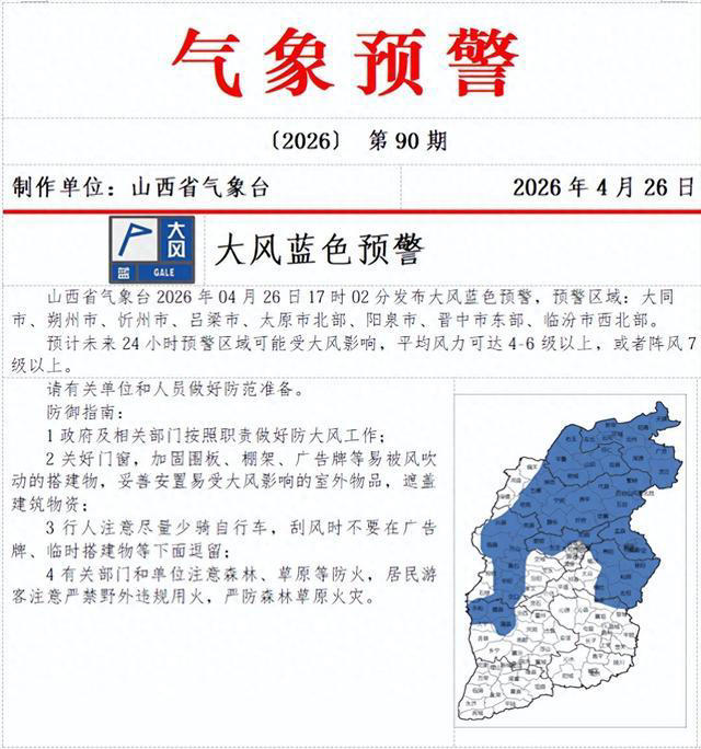 阵风7级以上!山西发布大风蓝色预警