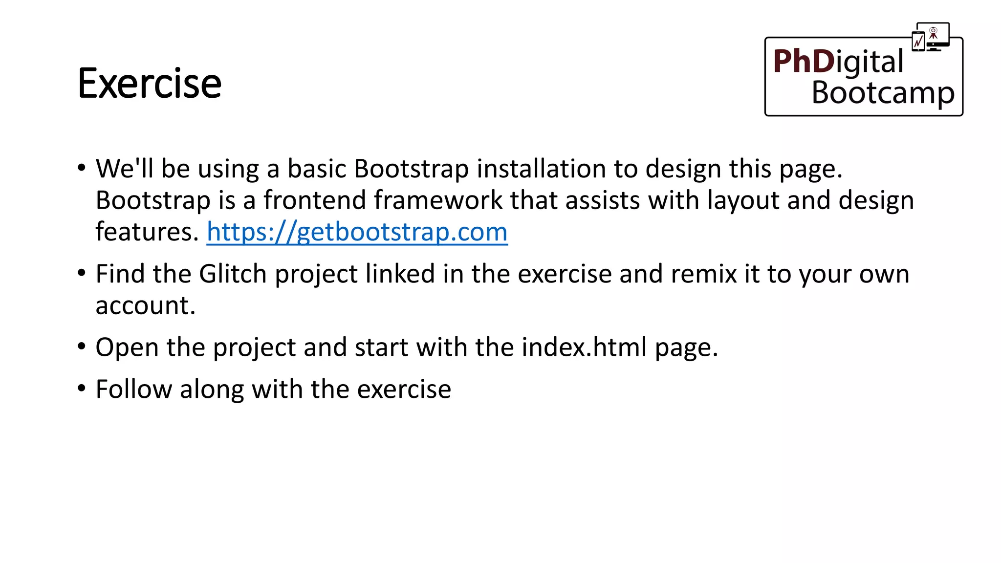 Based on this image's title: “22: Web Development Exercises – PhDigital Bootcamp”