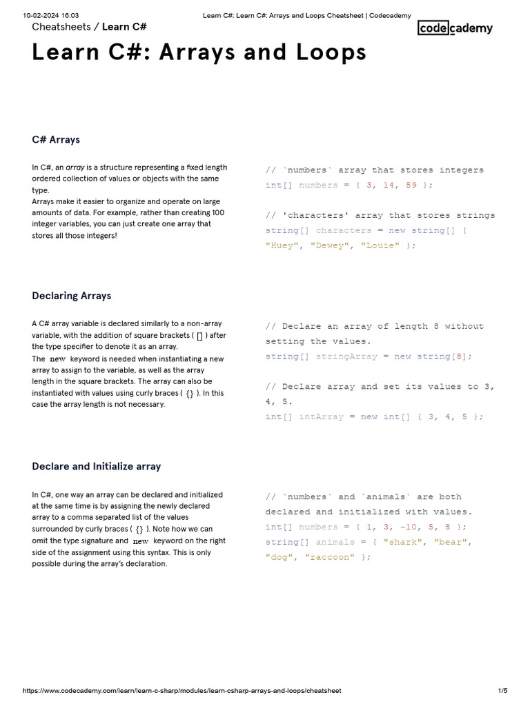 Learn C# Learn C# Arrays and Loops Cheatsheet Codecademy-combined - 1/8 ...