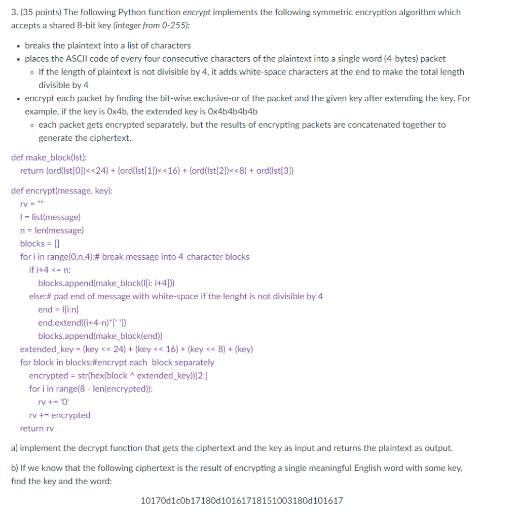 Solved 3. (35 points) The following Python function encrypt | Chegg.com