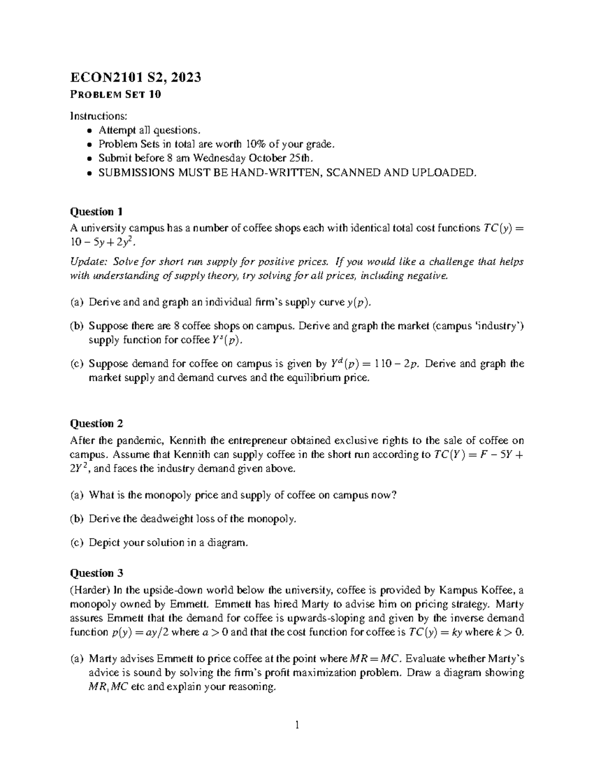 PS10 Questions ECON2101-updated - ECON2101 S2, 2023 PROBLEM SET 10 ...