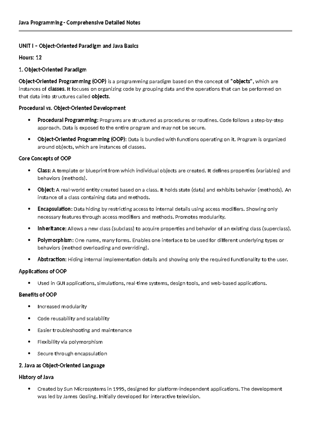Java Programming Comprehensive Notes: UNIT I - OOP & Java Basics - Studocu