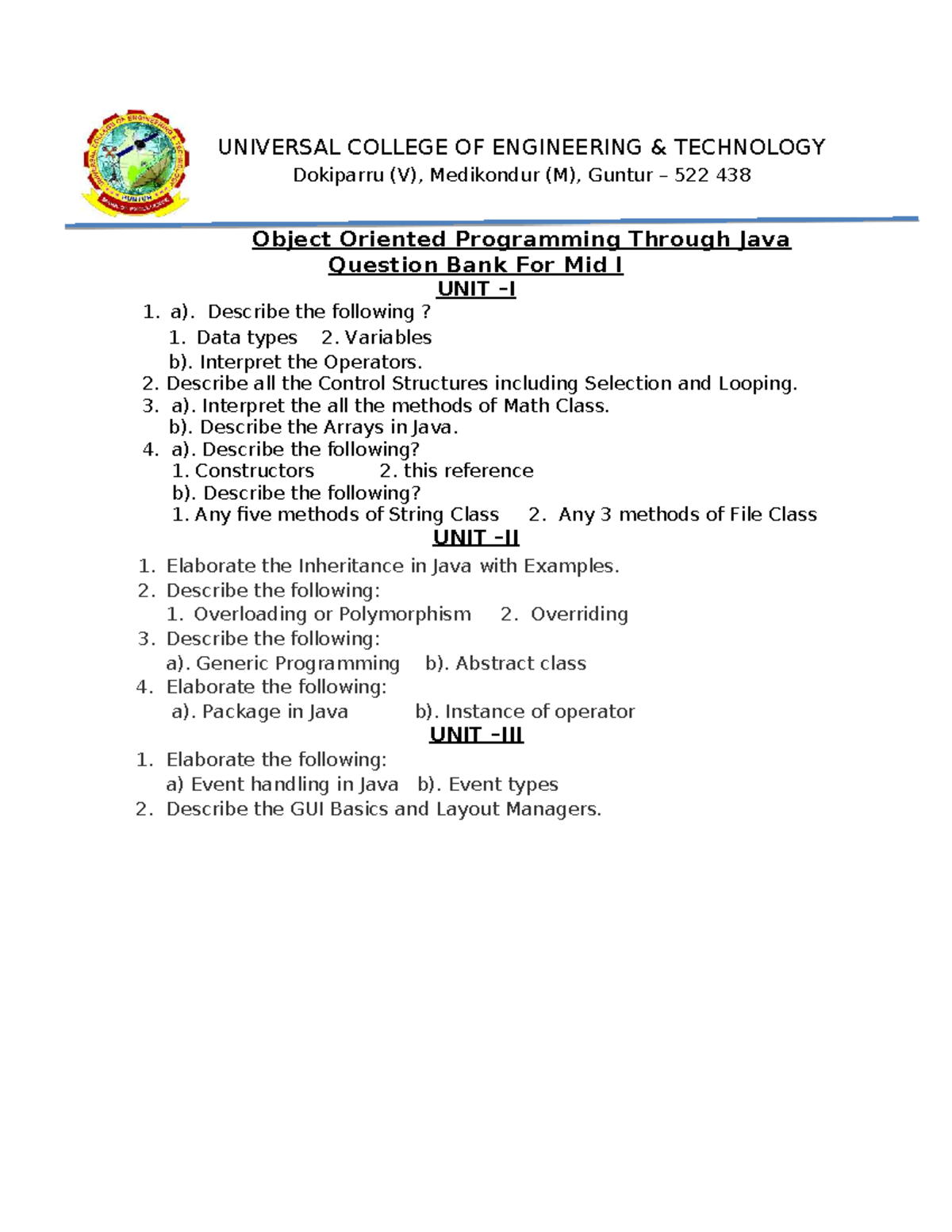 R20 OBJECT ORIENTIED PROGRAMMING THROUGH JAVA - U NI T-II JAVA ...