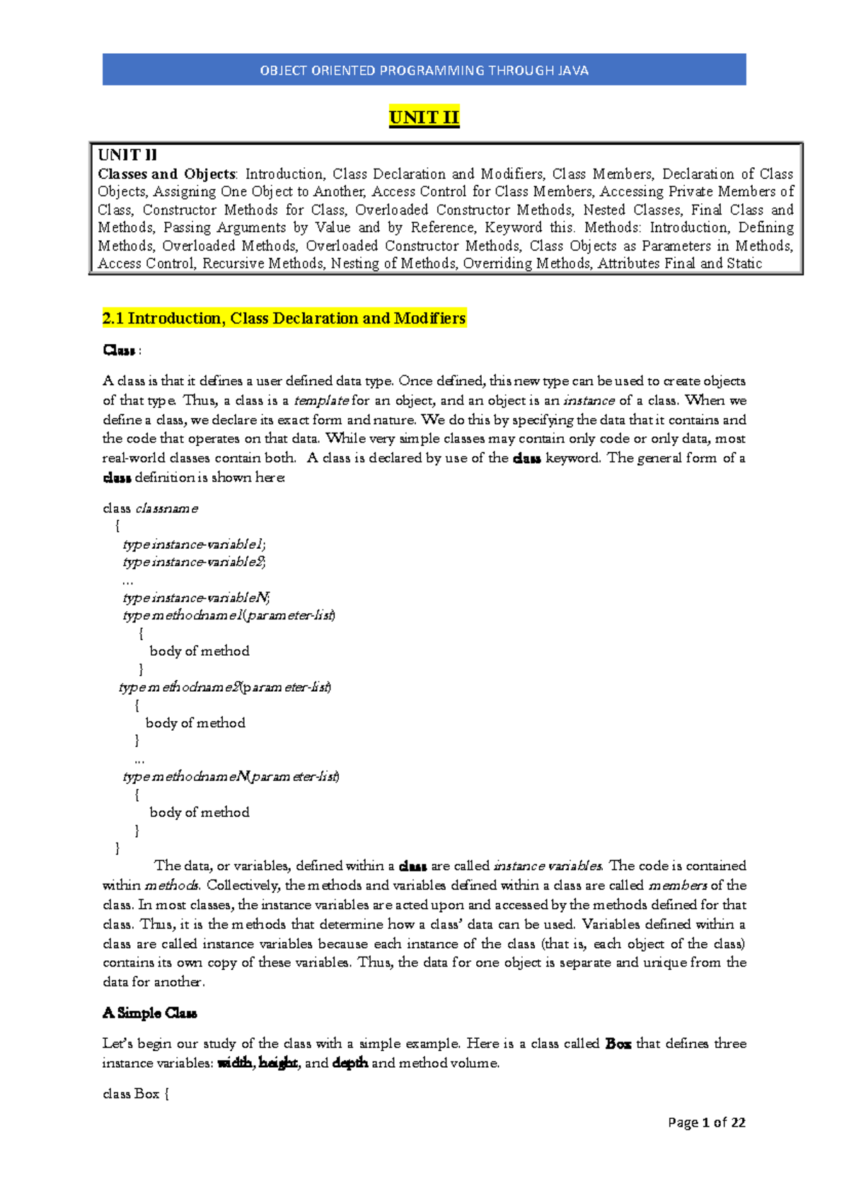 JAVA UNIT II - Java notes - UNIT II UNIT II Classes and Objects ...