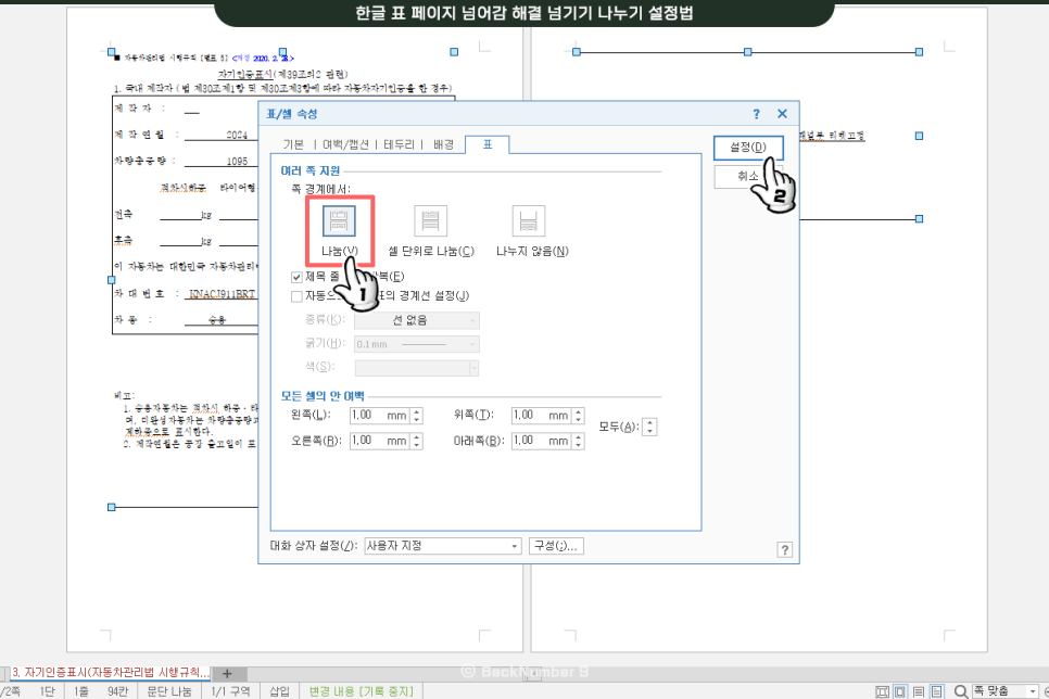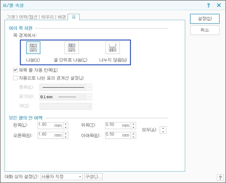 한글 표 페이지 넘어감 해결 넘기기 나누기 설정법 : 네이버 블로그