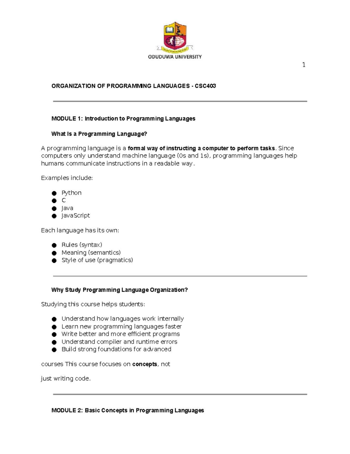 CSC403 Module 1: Intro to Programming Languages Overview - Studocu