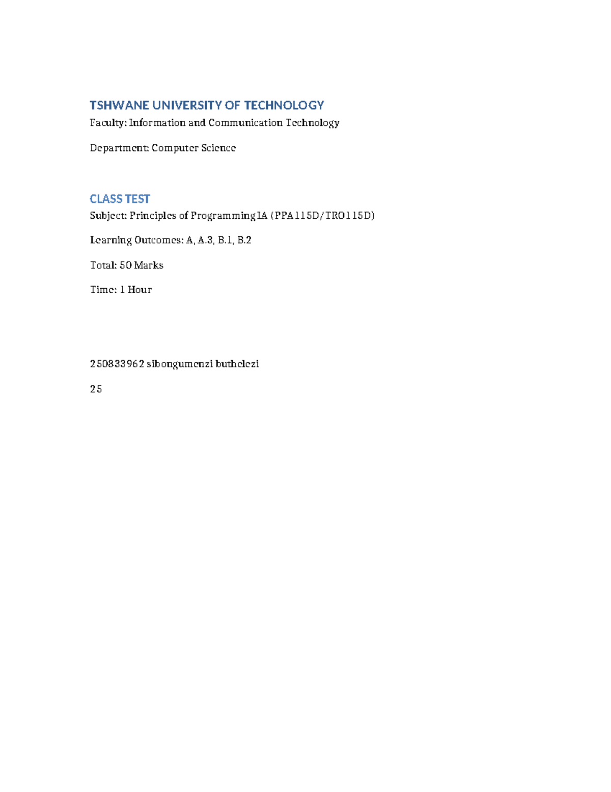 PPA115D Formal Test: Principles of Programming IA Study Guide - Studocu