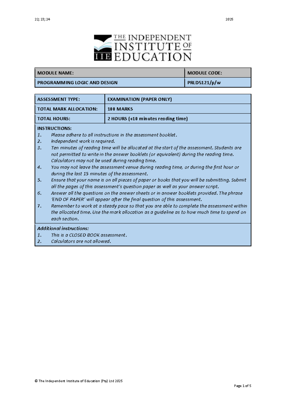 PRLD5121 Final Exam: Programming Logic and Design - Studocu