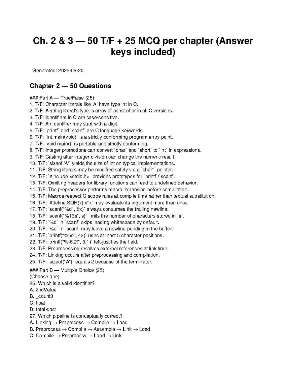 Ch. 2 & 3: 50 MCQs Each with Answer Keys - C Programming - Studocu