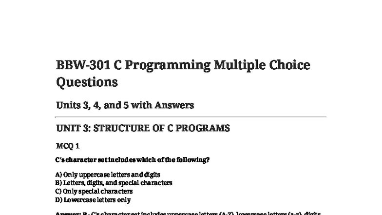 C PROGRAMMING MCQ - Comprehensive Questions and Answers - Studocu