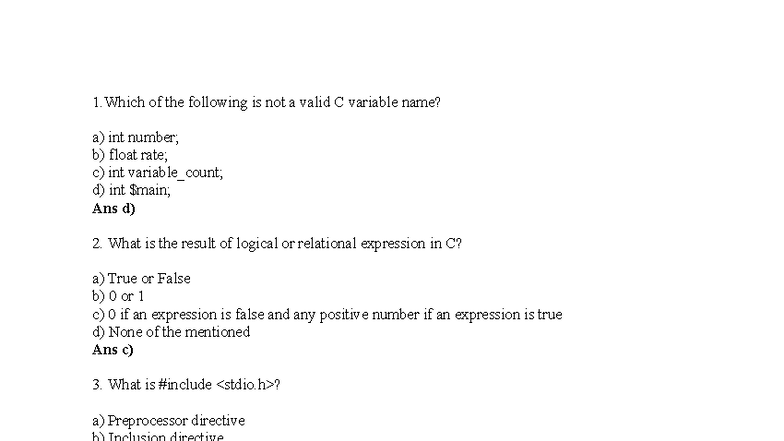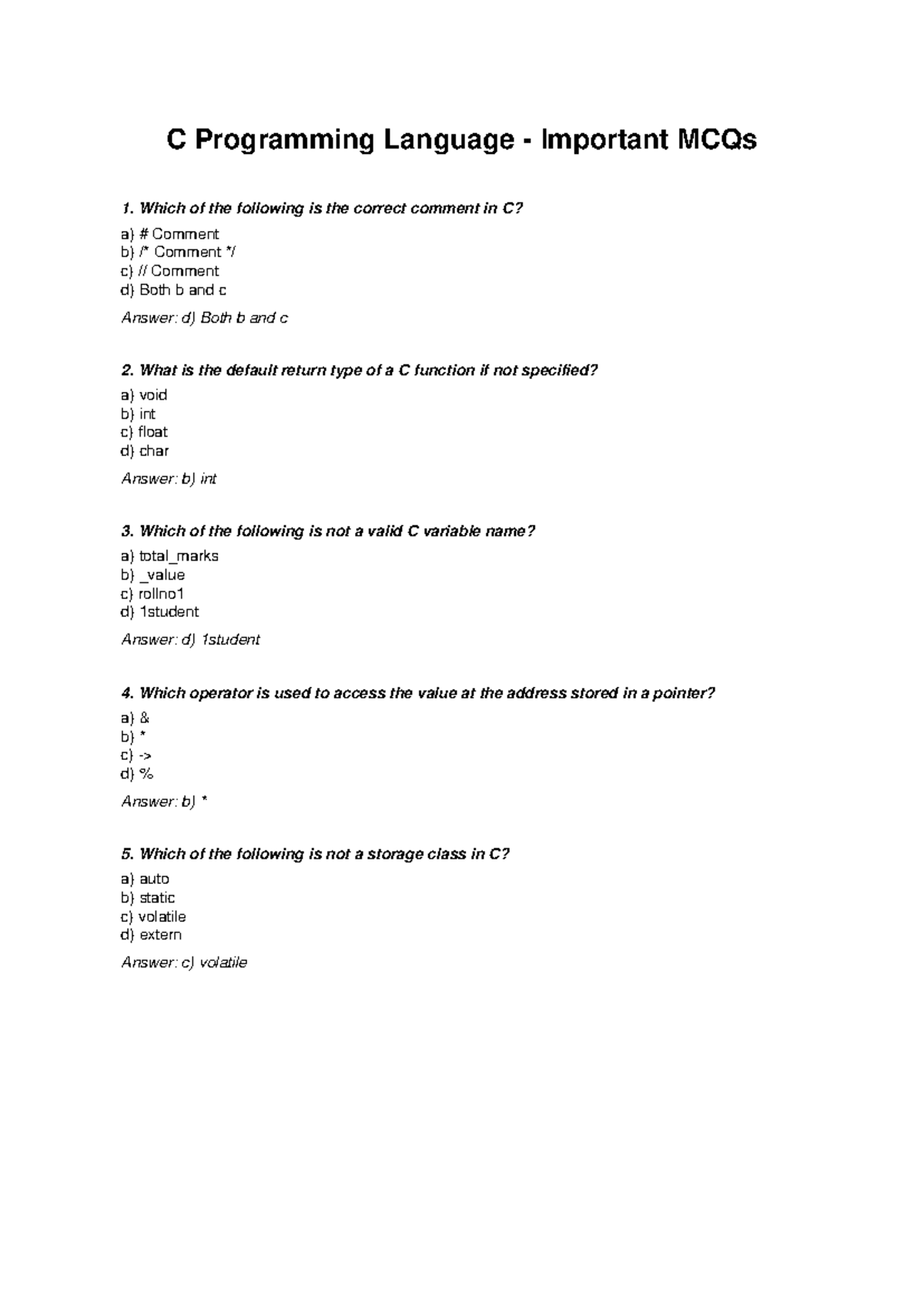 C Programming Language MCQs with Answers for Exam Preparation - Studocu