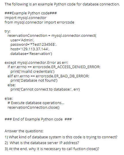 Solved The following is an example Python code for database | Chegg.com