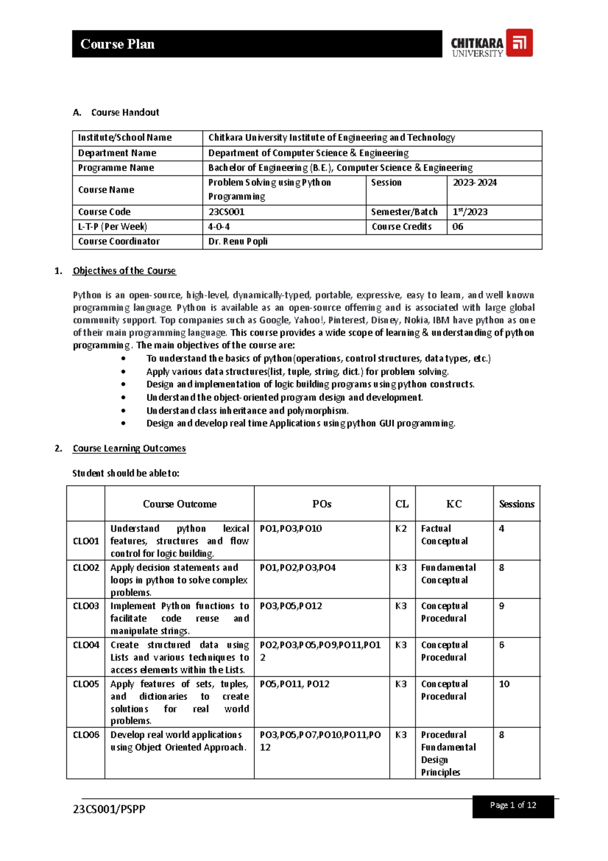 Python - Course Handout Institute/School Name Chitkara University ...
