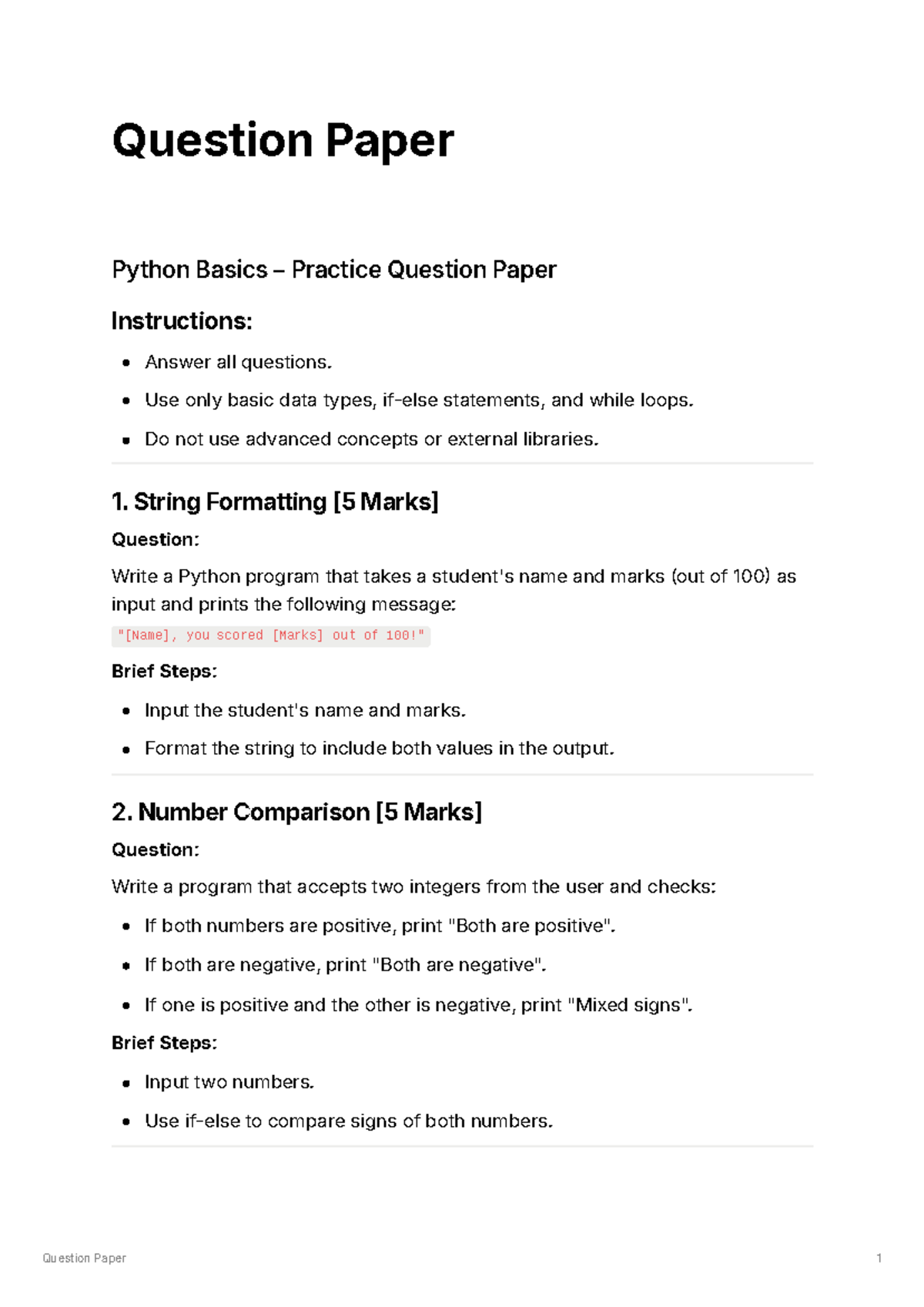 Python Practice Problems - Question Paper 1 Question Paper Python ...