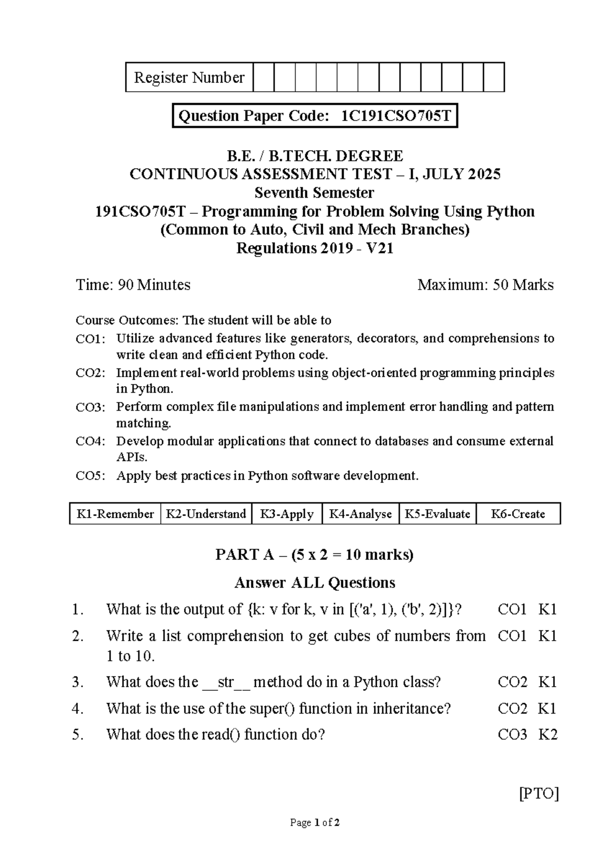 191CSO705T Continuous Assessment Test I: Python Problem Solving - Studocu