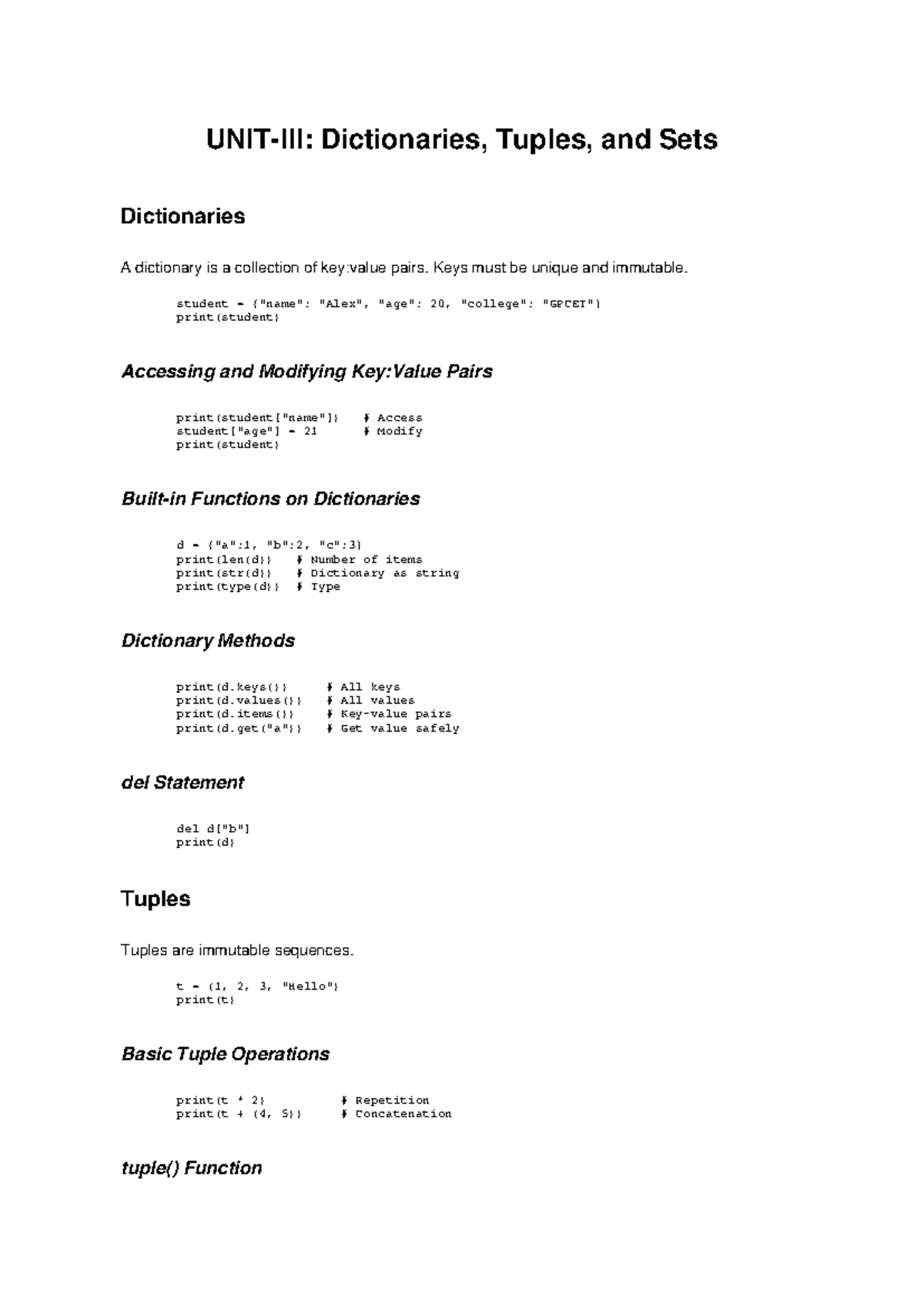 Unit III Python Notes: Dictionaries, Tuples, and Sets - Studocu