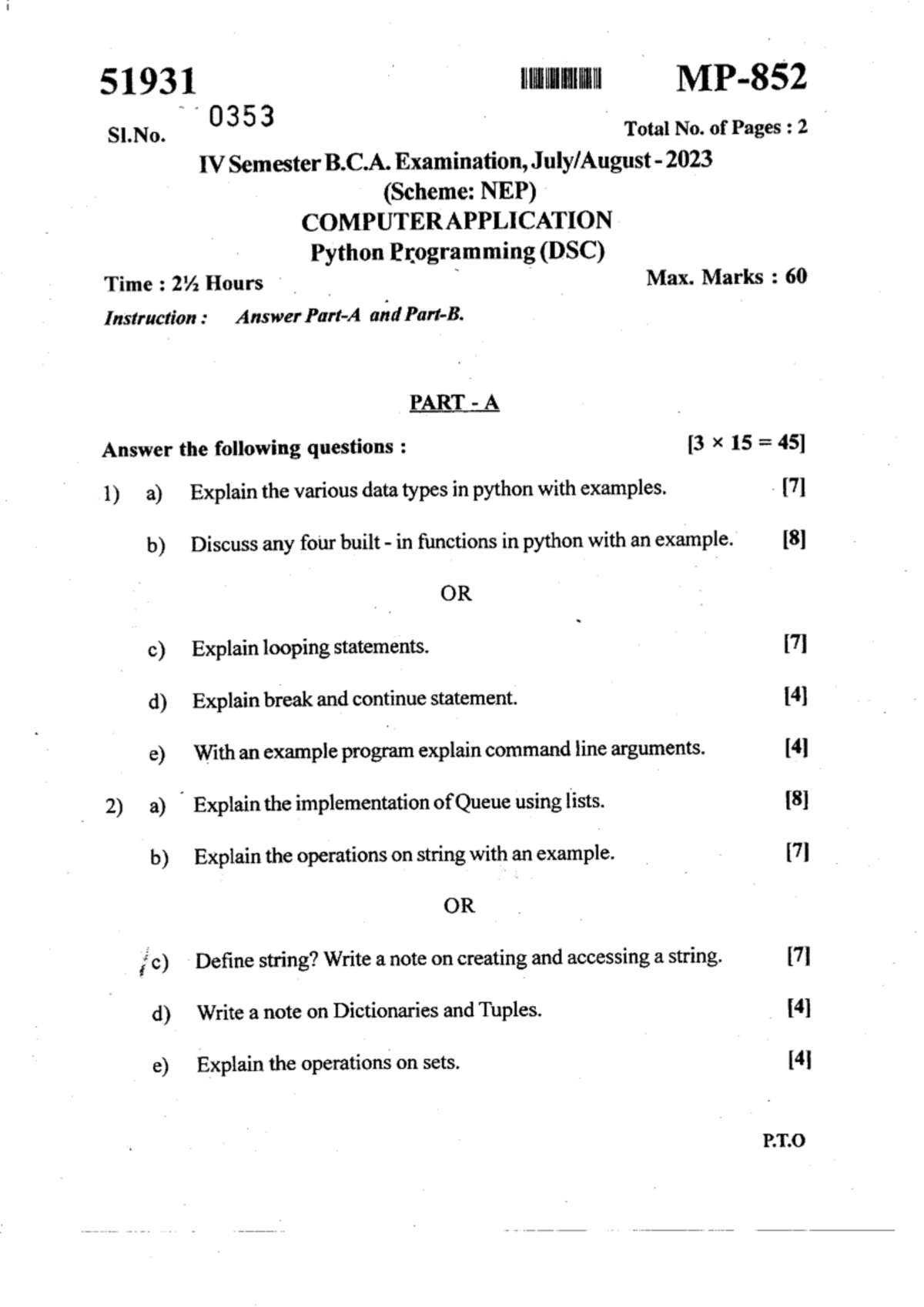 51931 0353 IV Sem B.C.A. Python Programming Exam QP 2023 - Studocu