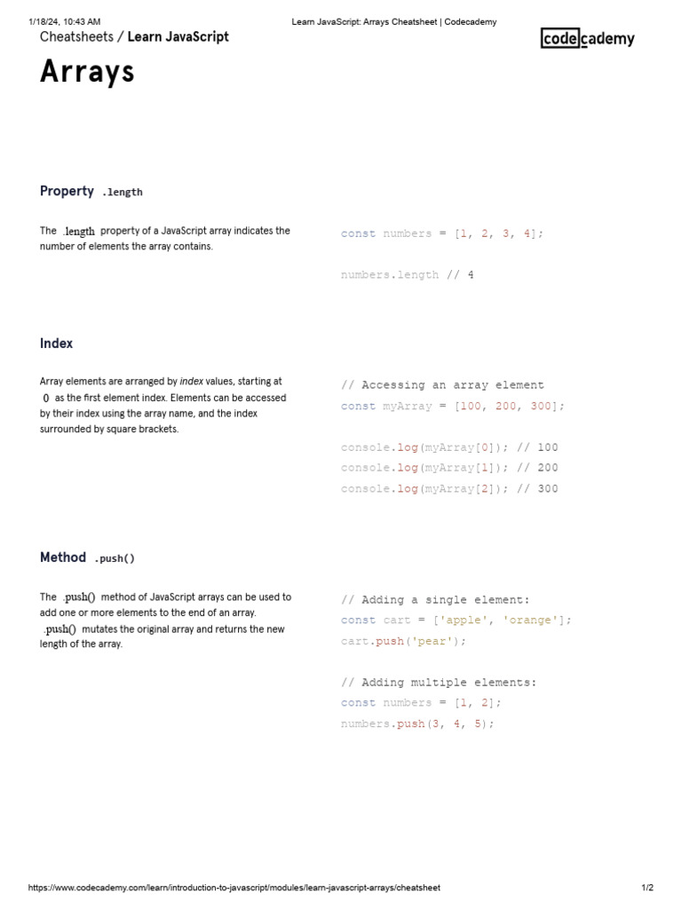 Learn JavaScript - Arrays Cheatsheet - Codecademy | PDF | Java Script ...