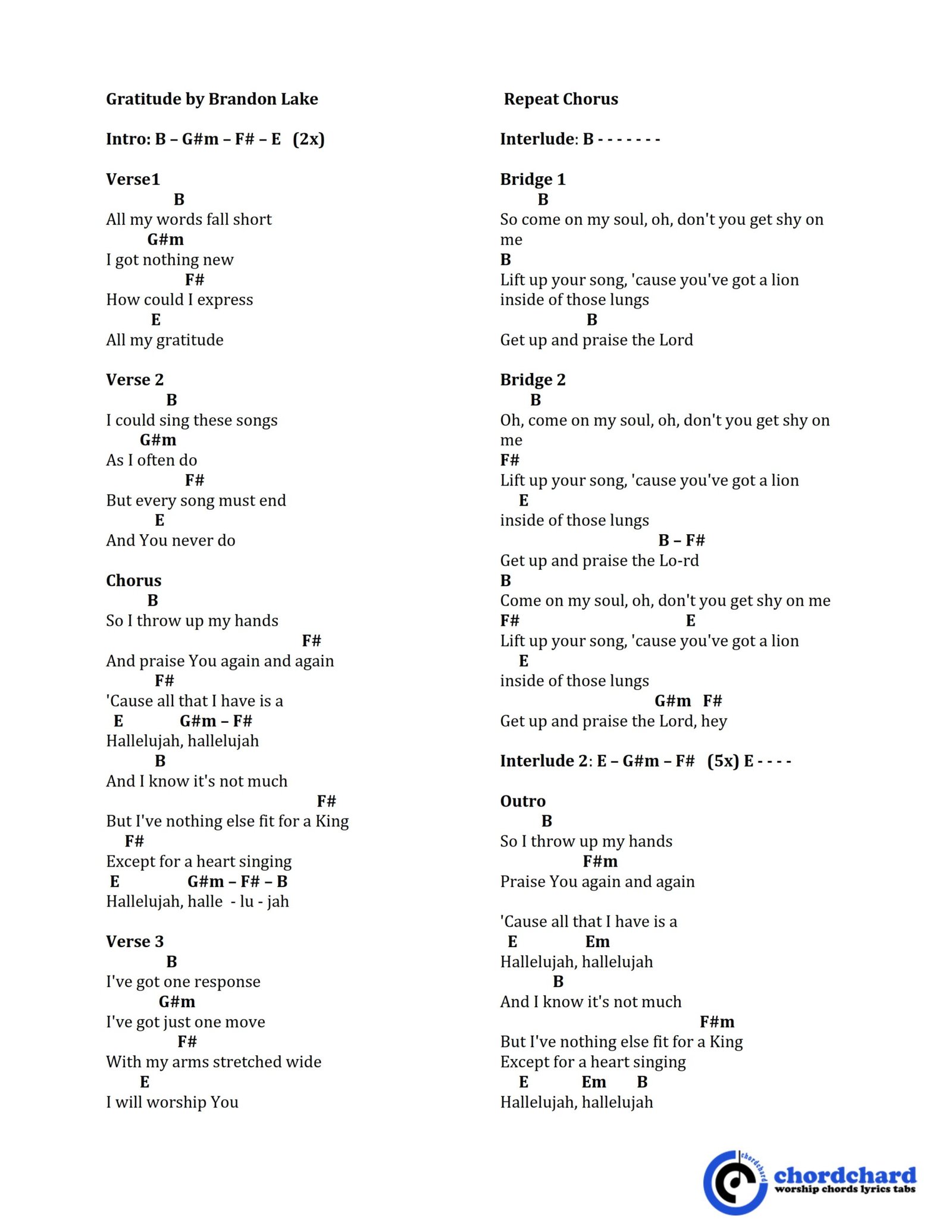 Gratitude (Live) (Brandon Lake) Chord Chart - G - 2 Column Layout | PDF ...