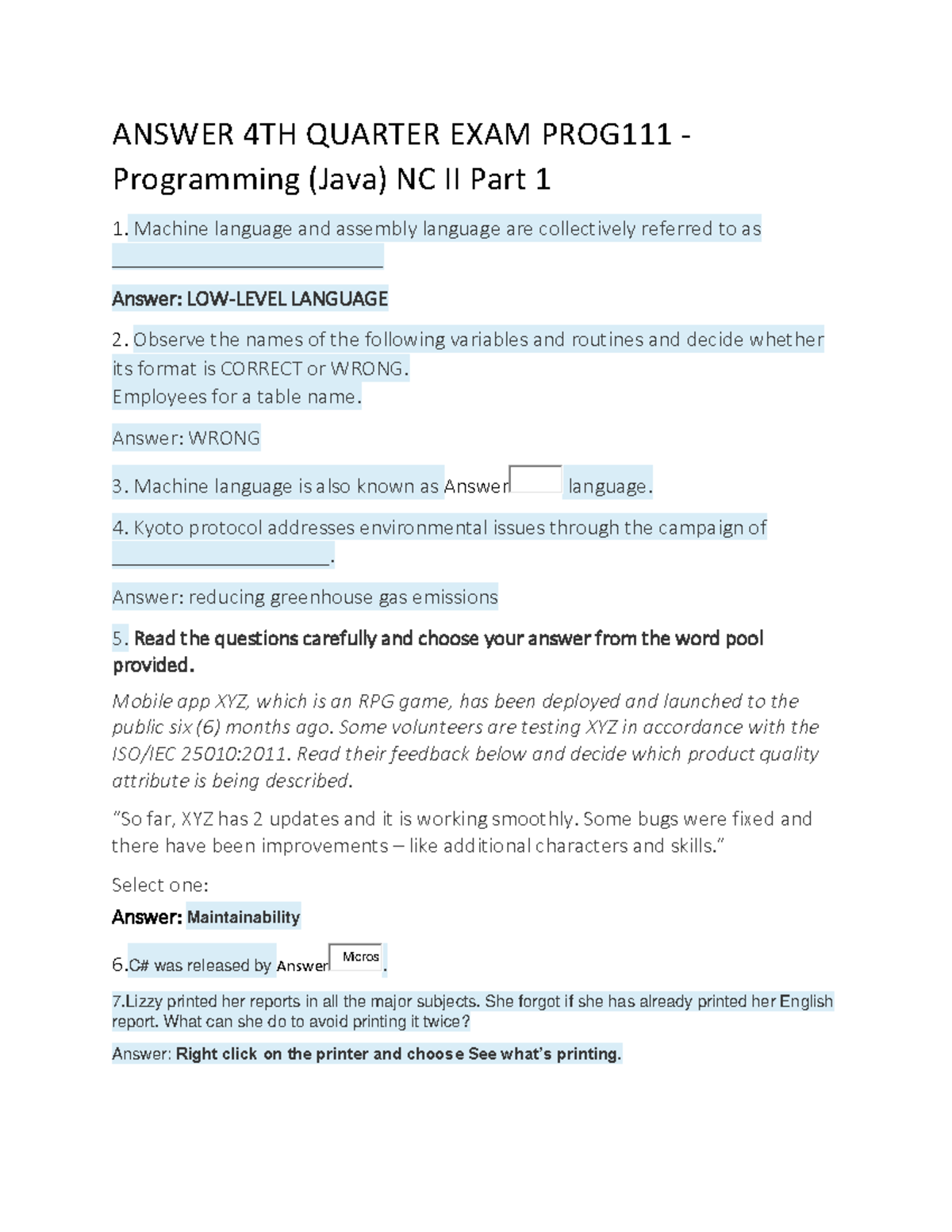 4TH QUARTER EXAM Programming (Java) NC II - Part 1 Review - Studocu