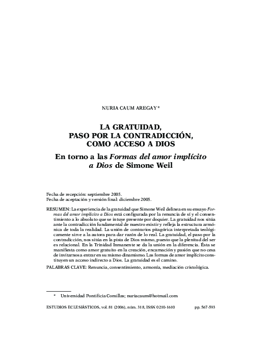 (PDF) La gratuidad, paso por la contradicción, como acceso a Dios. En ...