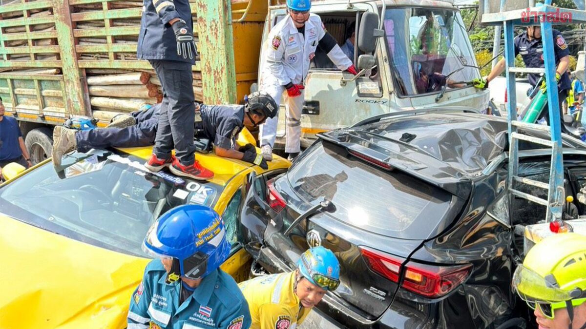 สิบล้อเบรคแตก ลงสะพานชนยับ กวาดมอเตอร์ไซค์-เก๋งระเนระนาด เสียชีวิต1เจ็บอื้อ