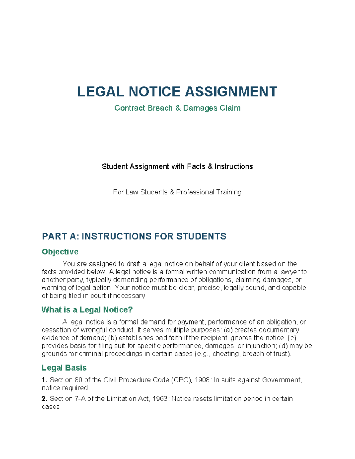 Legal Notice Assignment: Contract Breach & Damages Claim (LAW 101 ...