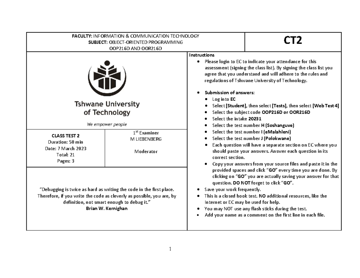 OOP216D OOR216D CT2 Class Test 2 Instructions and Guidelines - Studocu