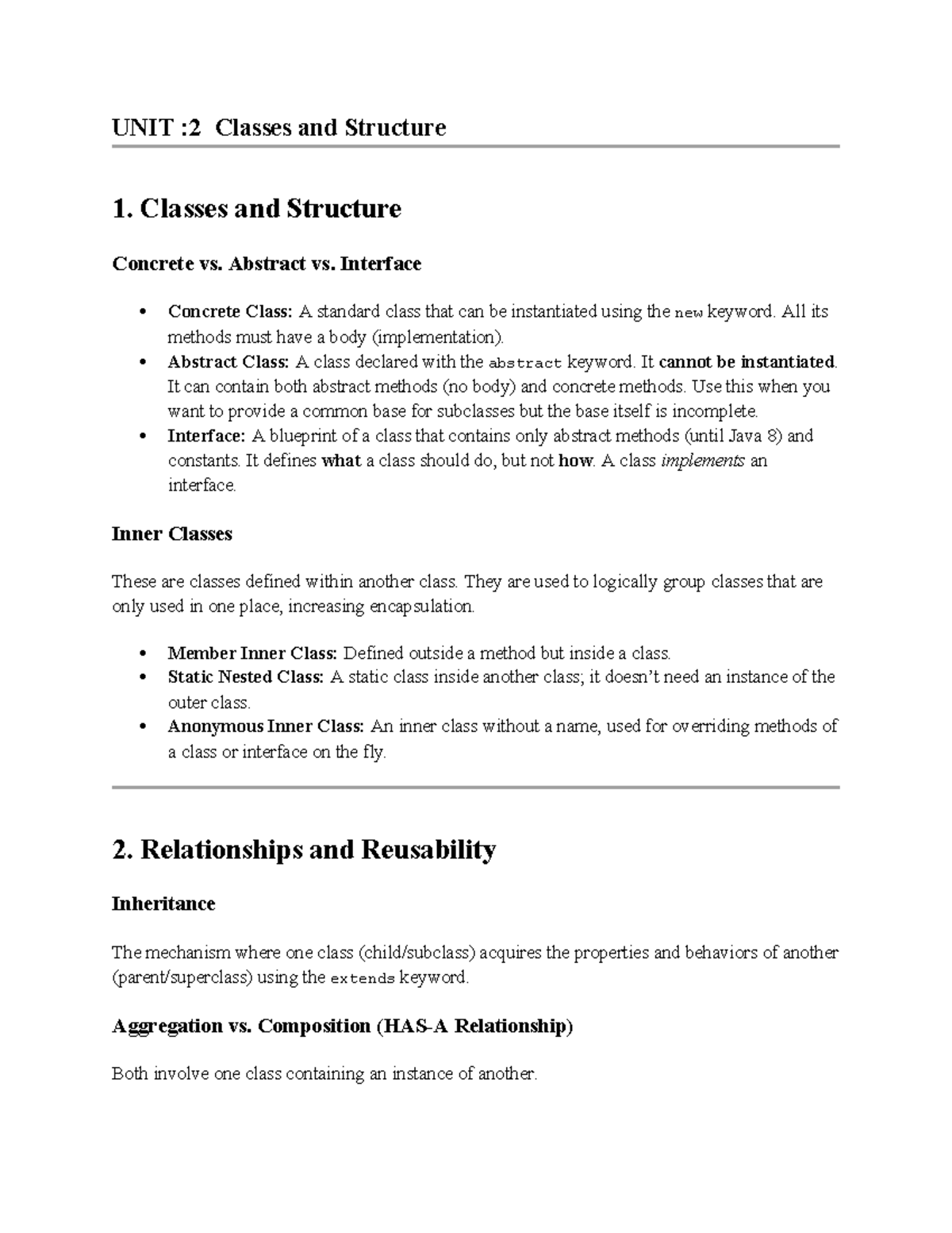 JAVA Notes: UNIT 2 - Classes, Structure, and Relationships - Studocu