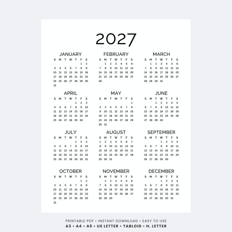 Jaarkalender 2027 afdrukbare één pagina | Volledig jaar in één ...