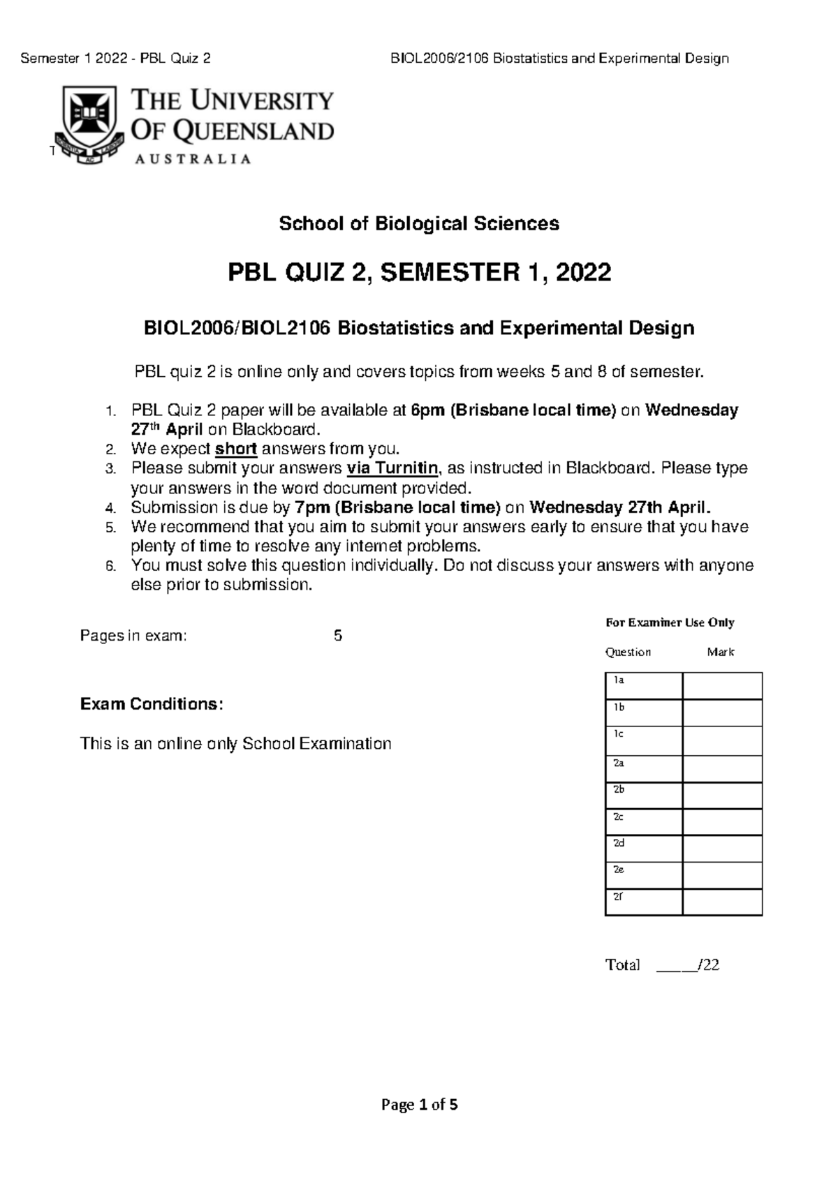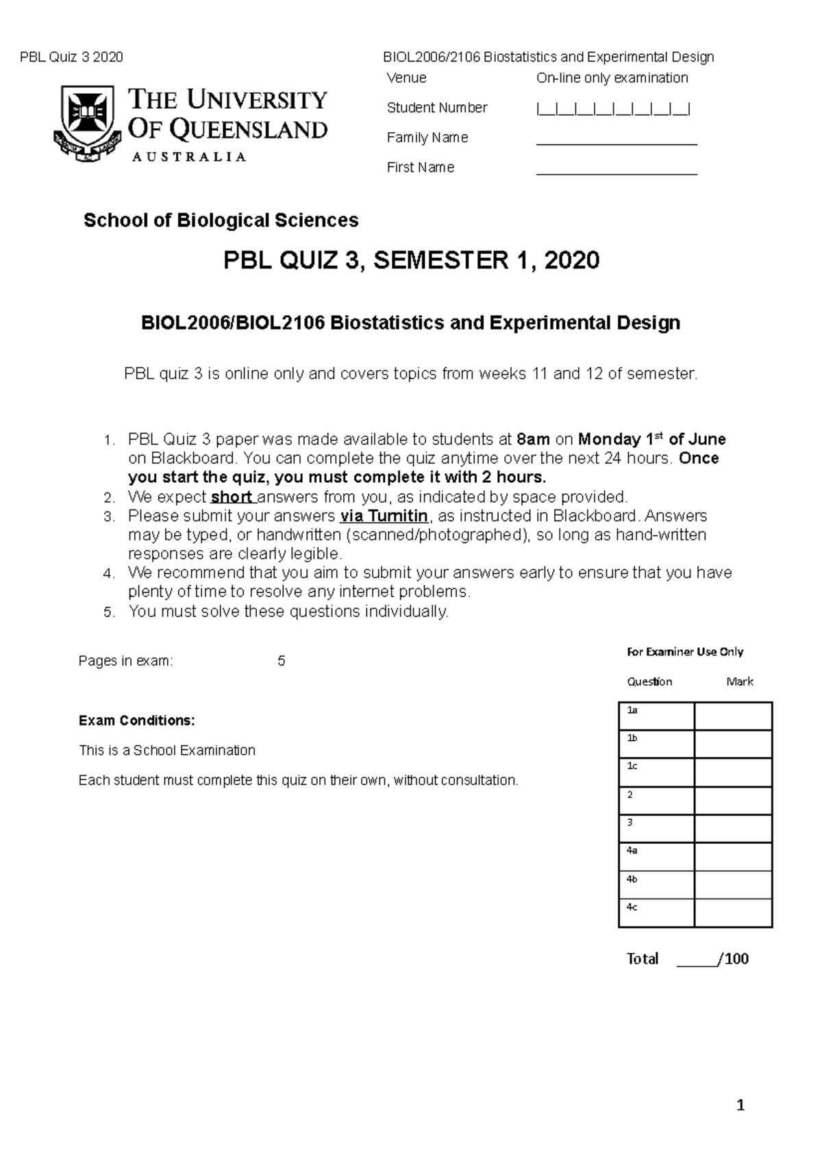 BIOL2006 - PBL Quiz 2 - Past quiz - This exam paper must not be removed ...
