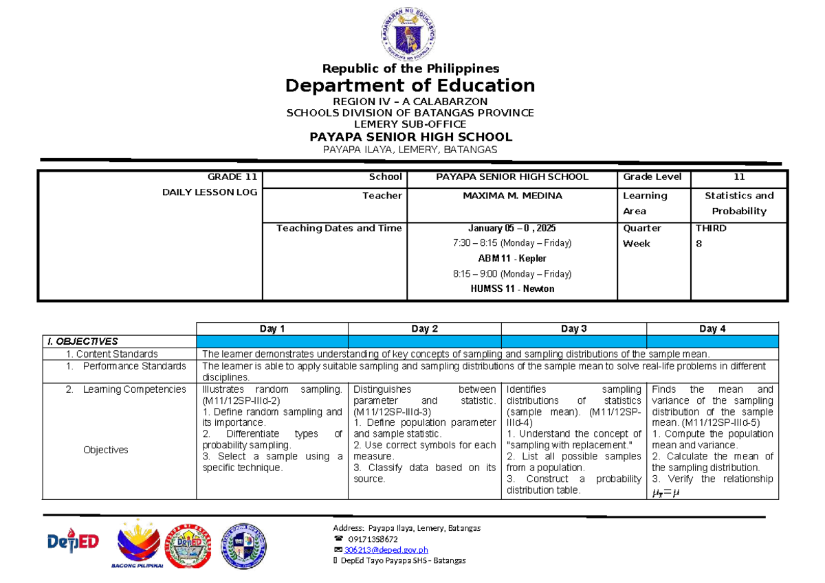 Stats 11 - WEEK 8 Daily Lesson Log on Sampling & Distributions - Studocu