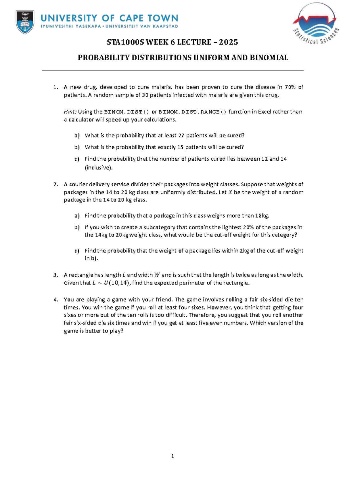 WEEK 6 LECTURE STA1000S 2025: Probability Distributions Overview - Studocu