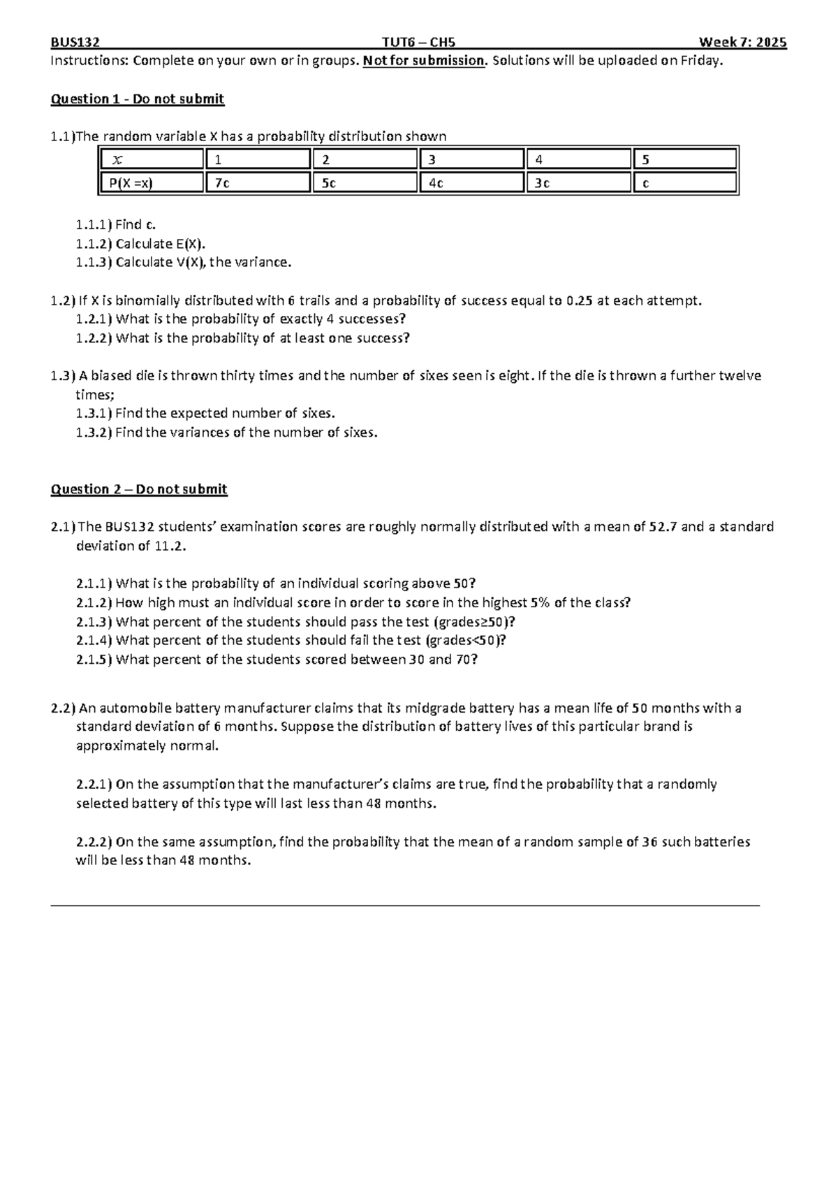 BUS132 TUT6 CH5 Week 7: Probability Distributions & Statistics ...