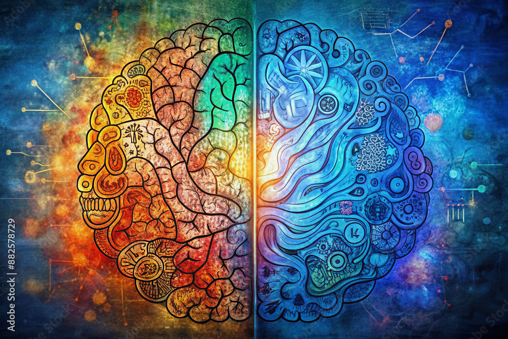 Left right human brain concept, textured illustration. Creative left ...