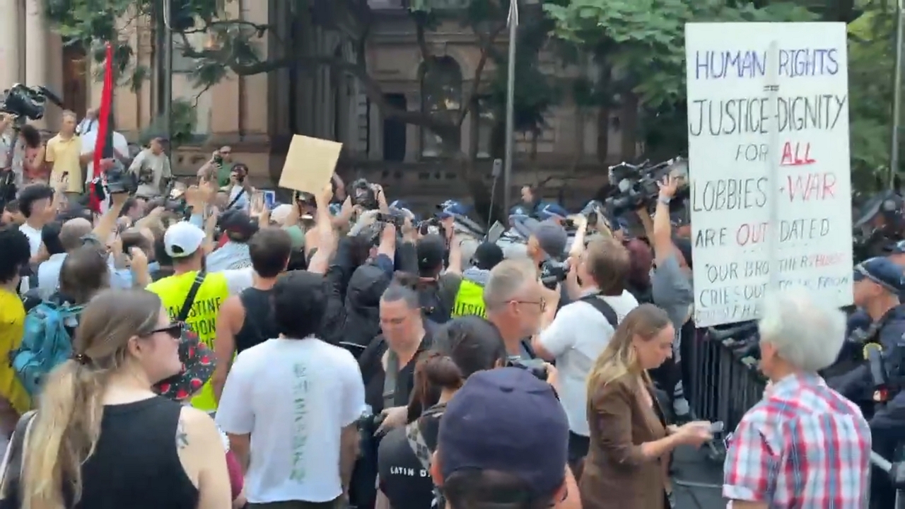 Police intervene as protesters gather near Town Hall in Sydney, Australia