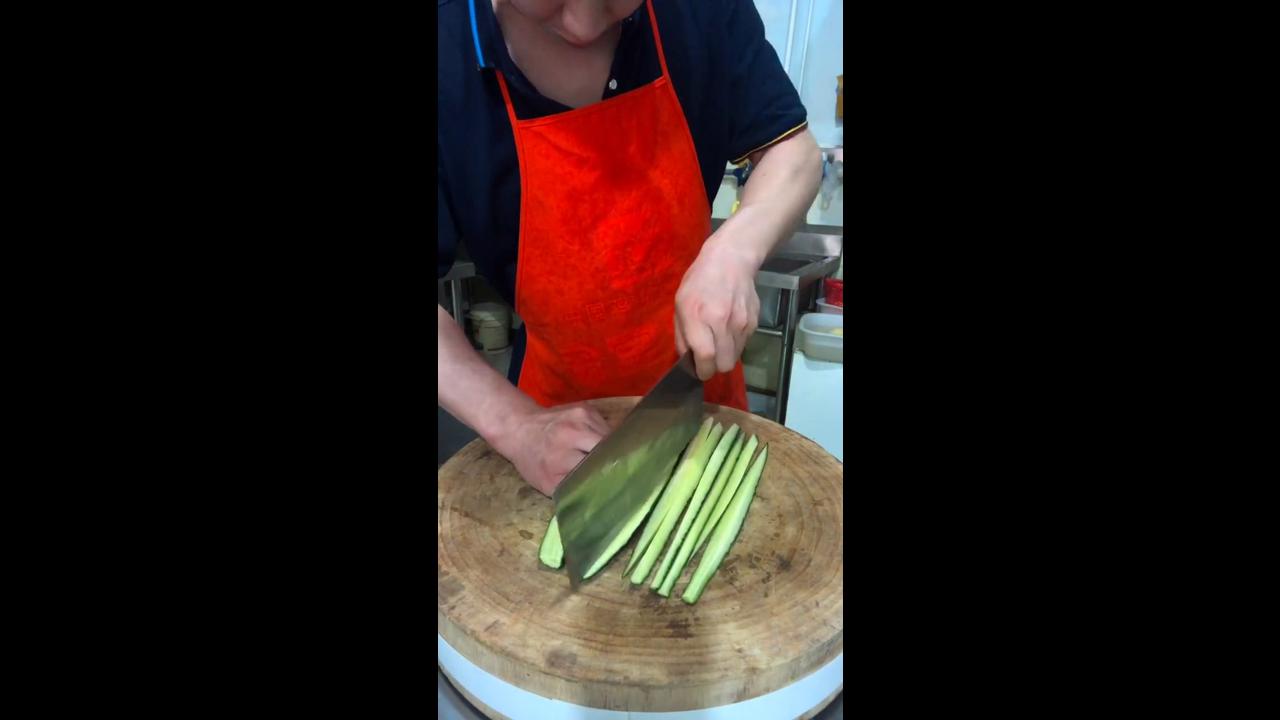 Cutting crossed cucumbers with sharp cleaver creating clean and ...
