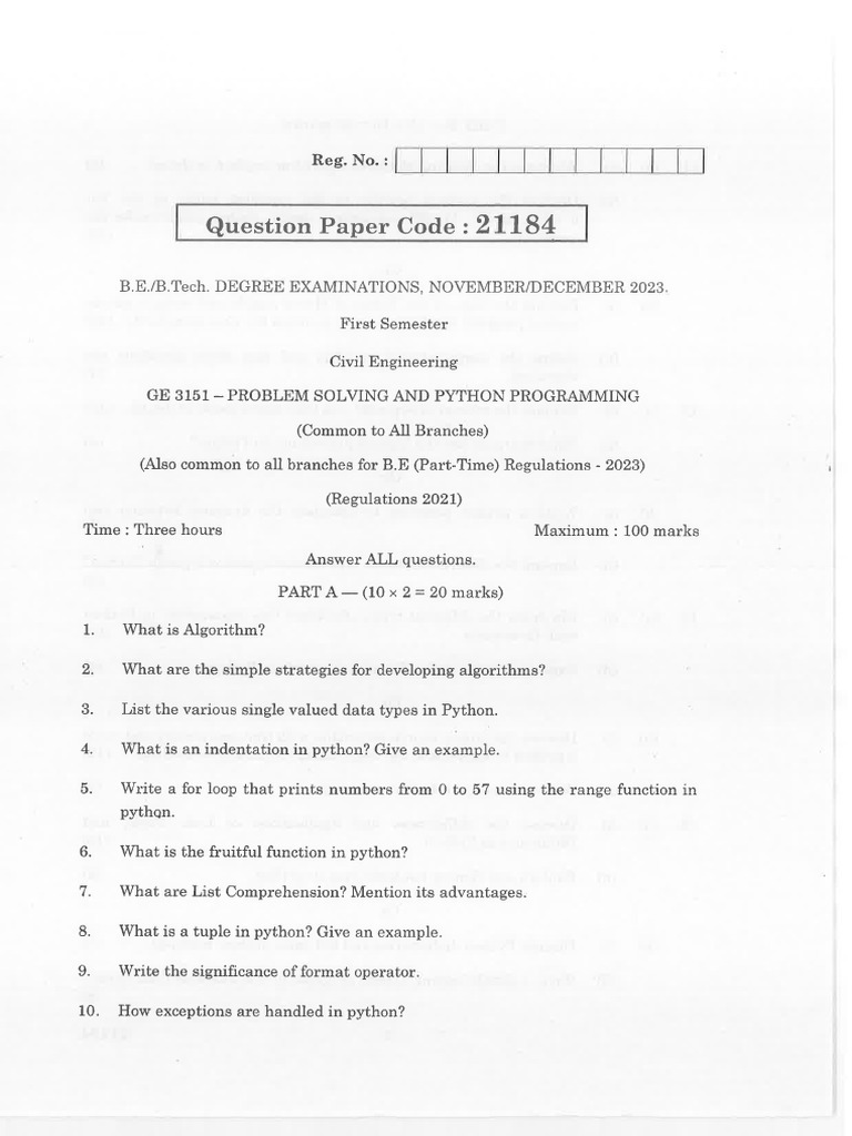 Based on this image's title: “GE3151 Python Programming Question Paper | PDF | Python (Programming ...”