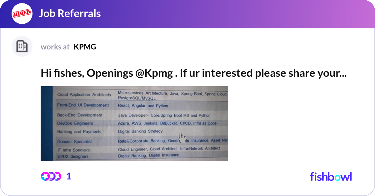 Hi fishes, Openings @Kpmg . If ur interested pleas... | Fishbowl