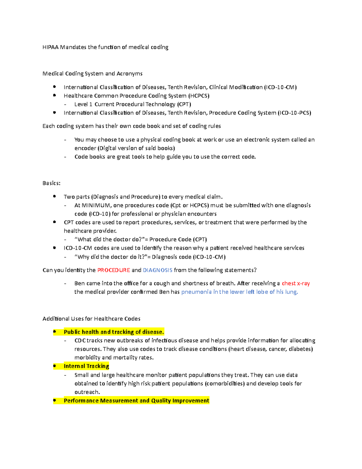 Week 1 . Lec 1 and 2 Notes - HIPAA Mandates the function of medical ...