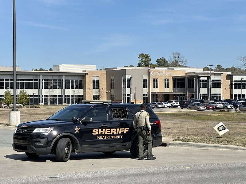 Based on this image's title: “Arkansas authorities respond to multiple school threats”