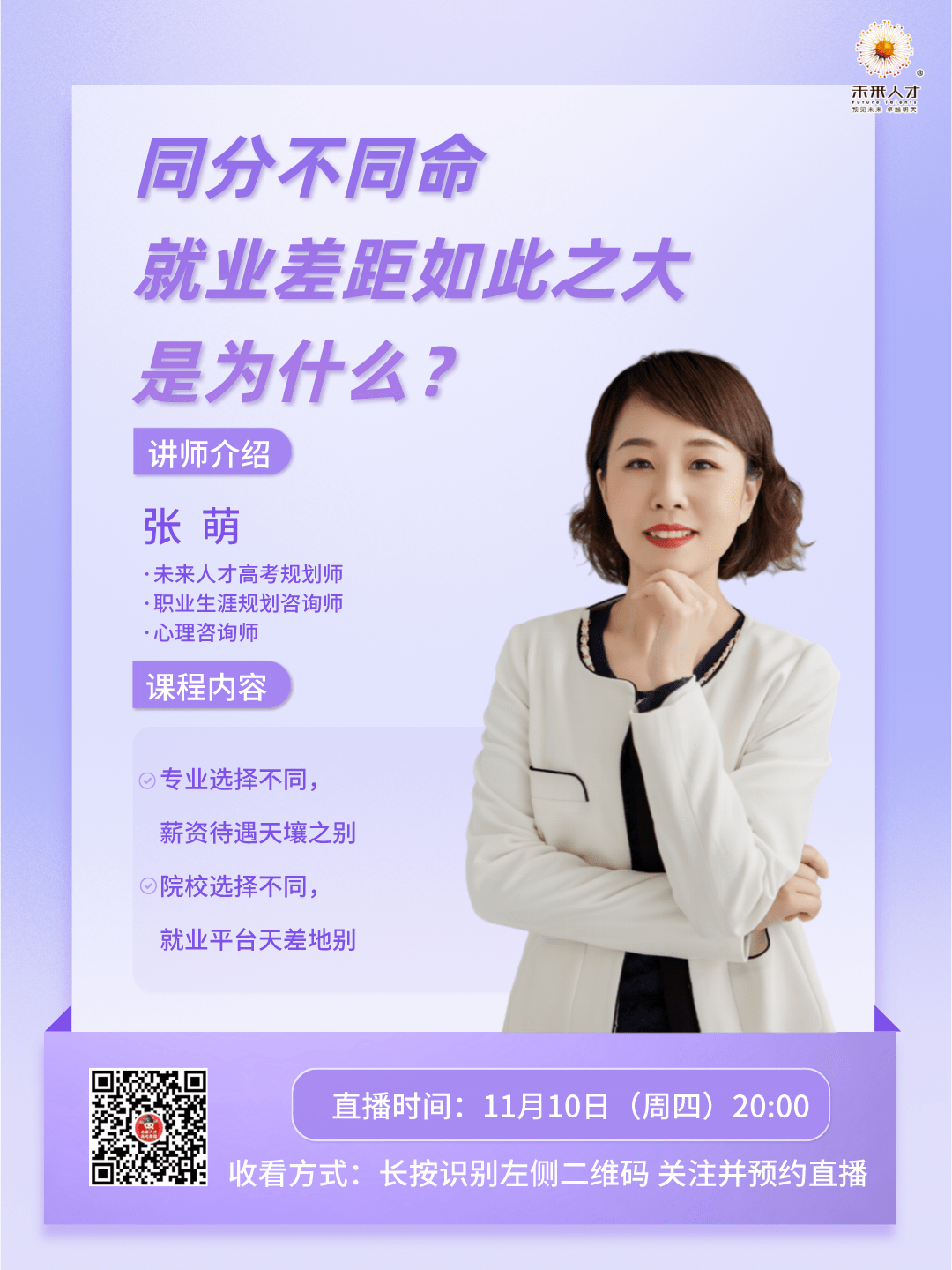 不同的院校不同的专业,发展截然不同。 家长帮孩子做志愿选择,怎么帮孩子选择呢? 欢迎关注今晚8:00直播,张萌老师与您聊聊《同分不同命,就业 ...