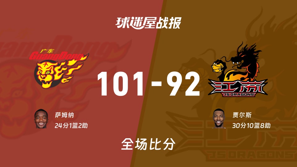 CBA常规赛:广东以101-92战胜江苏,萨姆纳24+1+2