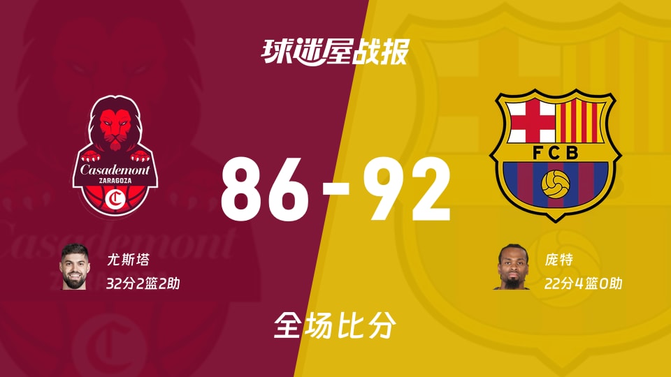 西篮甲常规赛:巴塞罗那以92-86战胜萨拉戈萨,庞特22+4